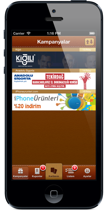Tüm üye firmaların sizin için oluşturdukları kampanları tek bir ekranda görebilir ve kampanya detaylarını, reklam banner'ın üstüne tıklayarak görebilirsiniz. Kampanyaları marka ismi, başlangıç ve bitiş tarihlerine göre sıralayabilir ve Facebook ve Twitter üzerinden paylaşabilirsiniz. Yeni eklenen ve sizin henüz görmediğiniz kampanyaların olduğunu, alt menüde bulunan Kampanyalar tuşunun üstündeki kırmızı ikon üzerindeki numaradan görebilirsiniz. Eklemiş olduğunuz kartlardan gelen anlık ileti uyarılarını dilediğiniz zaman kapatabilirsiniz.