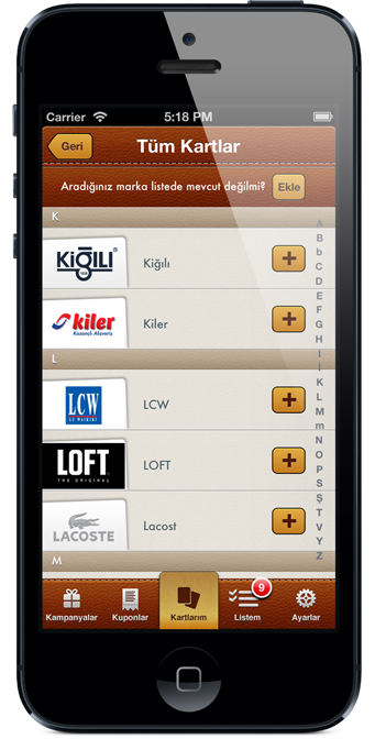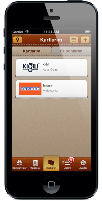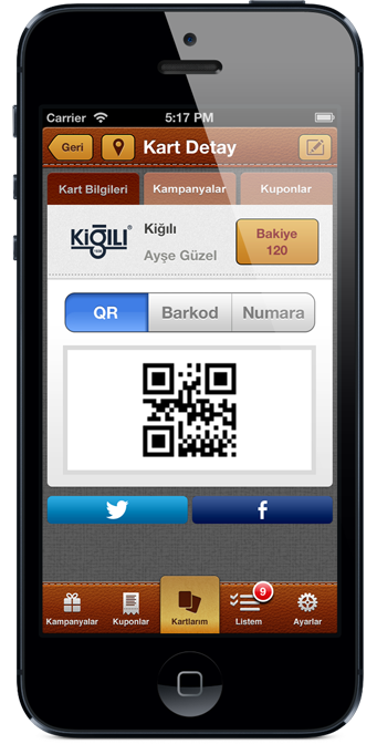 Tüm fiziksel indirim ve sadakat kartlarınızı tek bir ekranda görebilirsiniz. Eklediğiniz indirim ve sadakat kartlarını Kartım ekranına görebilir ve kullanmak istediğiniz kartın üzerine tıklayarak kart detay ekranına gidebilirsiniz. Kartınızı kullanmak için Kart detay ekranındaki QR ve Barkodu mağaza görevlisine göstermeniz yeterli.